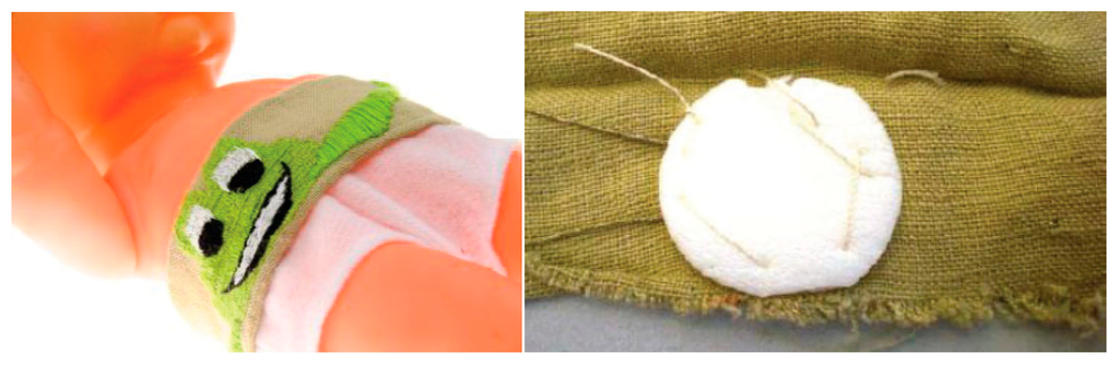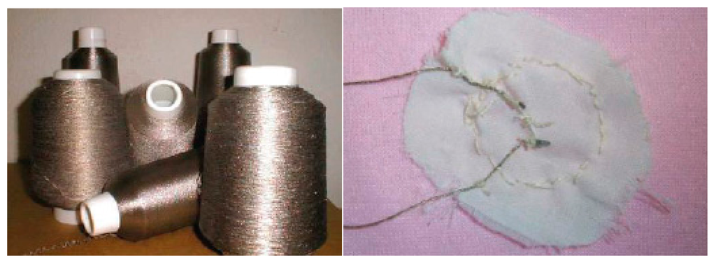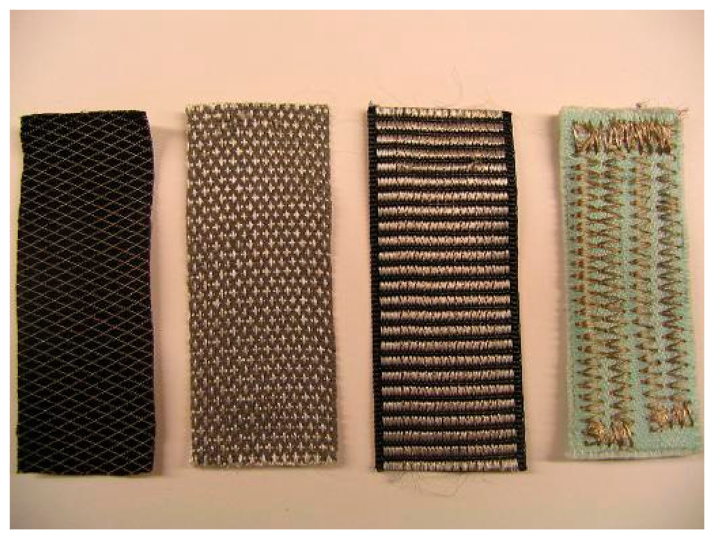 Owing to the disturbance and discomfort caused by hard electrical wires or electrodes, many researchers have utilized textile wires or textile electrodes to replace conventional wires and electrodes, which have achieved good responses. The innovation in terms of textiles is related to the use of conductive yarn integrated into a fabric structure for sensing and acquisition of signals such as electrocardiogram, electromyogram, respiratory activity, skin conductivity, and index of motion. As shown in Figure 10, the conductive yarns can connect the sensors or electrodes with external circuits instead of hard wires through two main fabric manufacturing techniques—woven textiles and knitted textiles—which makes the monitoring system light-weight and comfortable. Textile electrodes are a new, attractive choice for biopotential measurements. These special electrodes are made from fabric with electrode appearance. Figure 16 shows four textile electrodes of different materials and structures. Generally, textile materials are insulators, but in textile electrodes, conductive yarn is weaved, knitted or embroidered into a fabric during the manufacturing process. Conductive yarn can be made, for instance, from silver-coated yarn or metal filaments can be braided into yarn [29]. With the seamless knitting technology, the elastic and adherent textile electrodes can be in close contact with the infant's skin [41]. However, the movements of the infant can lead to the poor quality of the data on physiological parameters while the textile electrodes are monitoring. To improve the electrical signal quality in dynamic conditions, a hydrogel membrane was used in Paradiso's work [42]. In addition, the high impedance in the electrode-skin interconnection also remains a major drawback of textile electrodes.