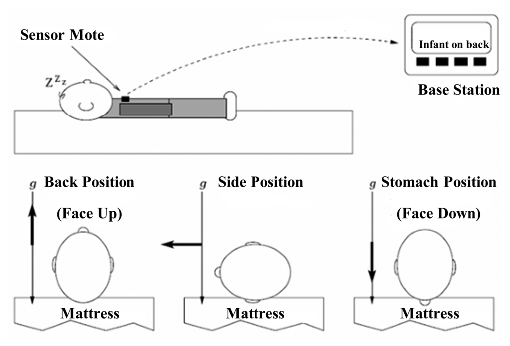 Alternatively, the indirect monitoring method is to monitor an infant's health condition through physiological activities and some special external environmental changes. For example, the sensors integrated into the clothing are able to determine sweating conditions according to the humidity of the patient's underclothes, and the detector installed on a walking stick can dynamically detect falling and measure pace of the elder people by utilizing a gyroscope chip to measure the angular velocity of the stick [26]. Chris et al. [23] developed a SleepSafe prototype utilizing a triaxial accelerometer attached to an infant's clothing to detect if the infant was sleeping on their back, side, or stomach. The prototype consists of an accelerometer sensor mote to monitor sleep condition and a wireless base station to receive and process sensor data, as depicted in Figure 11. The sensor mote is a SHIMMER mote and it is expected to be integrated into the fabric of the clothing with the technology trends of miniaturization. Sensor motes are created as an open-source hardware and software platform, combing sensors, low power wireless communication, and processing into a single architecture. These motes are also designed to have the ability to “self-organize” (resulting in a self-configuring WSN), and carry out onboard signal processing and distributed inference tasks prior to sending relevant information to a central controller [38]. The three different positions (back, side, and stomach) are measured as the opposite direction, perpendicular and aligned in the same direction to that of gravity, as described in Figure 11. With a small TinyOS program, the sensor mote's processor reads the triaxial accelerometer sensing data periodically via the on-board analog-to-digital converter (ADC), packetizes the data, and sends the packet wirelessly to the base station for processing.