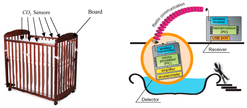 Some other non-wearable sensor systems for the indirect monitoring method have been proposed in recent years. Hung et al. [13] proposed a crib designed with metal-oxide based CO2 sensors implemented in the bars around the baby to monitor the infants' respiration, as depicted on the left of Figure 12. The processing board, which contains sensor signal processing circuits and comparators, is used to transmit and receive data. By monitoring the outputs of these CO2 sensors, researchers can detect whether there is anything unusual with the infant's respiration. Different kinds of tests have been carried out to verify the function of the crib with regard to various head directions and positions of the infant, and several disadvantages of this respiration monitoring system were pointed out. For instance, the outputs of a certain sensor and two different sensors were not repeatably identical for the environment with same concentration of gas. In addition, the output signals drifted over time. In addition, the functions of the metal-oxide CO2 sensors were affected by humidity and temperature. Therefore, it is necessary to find a sensitive yet stable sensor with performance uniformity and take some measures (such as feedback control) to reduce the impact from humidity and temperature on the sensors. As another example of indirect monitoring, a triaxial accelerometer was adopted to measure the water motion of a bathtub by detecting abnormal wave motion and giving a warning to guardians via a wireless communication receiver to prevent the infant drowning in the bathtub, as depicted on the right of Figure 12. According to the experiments conducted in real homes, the researchers acquired the data on wave motion during bathing, which can be used to distinguish a normal signal which occurs during a bath and an abnormal signal caused by drowning [24].