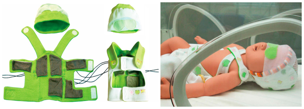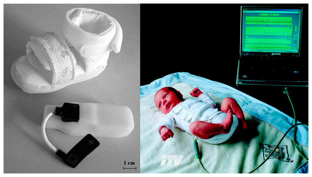 Multi-parameter monitoring provides a comprehensive, safe, reliable and accurate healthcare service, especially for the premature infants in the NICU. For instance, the baby glove swaddle [23] depicted in Figure 13 wraps and secures the child comfortably with two plates which contain sensors inside that monitor temperature, hydration and pulse rate – three main health considerations important to the development of an infant. The sensor mote, which contains a thermistor temperature sensor along with electrodes that monitor the infant's pulse rate and hydration, and the circuitry unit are integrated into the glove. The sensor plates are placed posterior and anterior to the child's upper torso, which is the body's largest thermal mass. The wireless base station allows the information exchange between the sensor mote and a variety of computing systems such as PDAs, cell phones and laptops, which allows parents or nurses to be alerted when the child's vital signs have exceeded predefined health settings. The BBA bootee [12] shown on the left of Figure 14 has been developed based on an oximetry module and a triaxial accelerometer to achieve multi-parameter monitoring for infants. Sensors data connection and transmission are managed by a microcontroller transceiver through a short-wave radiofrequency link. The adjustable straps made of elastic textiles ensure contact between the SpO2 sensor and the skin and permit the bootee to be fitted to the foot as the infant grows from one size to another. With the sensors integrated into the bootee, it is able to measure the pulse oximetry and detect the motion and the prone position of infants. In addition, with fully integrated sensors, the sensory baby vest [9] on the right of Figure 14 could also achieve multiple parameter monitoring in the NICU or in the home environment, and the parameters may include respiration, heart rate, temperature and humidity, e.g., by sweating. By utilizing different sensors integrated together, vital signs such as PPG, ECG, systolic and diastolic blood pressure, heart rate and body temperature can be monitored at the same time, and the data collected by the integrated sensor system can be correlated to form an overall framework of the infant's health, which greatly improves the efficiency of clinicians' work. However, multi-parameter monitoring also have problems with large energy consumption and mutual signal interference between different sensing modules, which need to be solved in the future.
