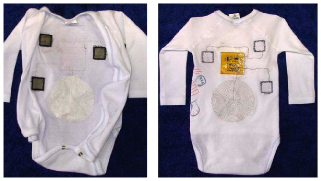 Single parameter monitoring is monitoring health status through one pivotal parameter, which can simplify the healthcare monitoring system and increase the comfort of infants. The thermometer, sphygmomanometer and other medical measuring instruments mostly utilize the principle of the single parameter method. In order to alleviate the risk of the SIDS of infants (especially for preterm infants), a constant monitoring measurement of ECG is necessary for the premature infants in the NICU. Coosemans et al., reported some prototypes intended for continuous monitoring of the ECG of infants using a garment embedded system [31]. All electronics including textrodes (textile electrodes) and inductive coils are mounted on a flexible circuit to facilitate integration in the infant's pajamas, as depicted in Figure 15. The circuit and conductive wires are embroidered in the infant's suit for the purpose of comfort. This system only has three pieces of textile electrodes for single ECG measurement, which makes the data processing circuit simple and physically small. The features of this kind of single parameter monitoring device usually contain only one kind of sensor to measure the specific parameter, and the circuit is simple, which leads to low power consumption. The single physiological parameter monitoring method shows great potential in reducing the risk of SIDS, usually caused by cardiac arrest, which can be effectively monitored through ECG monitoring.