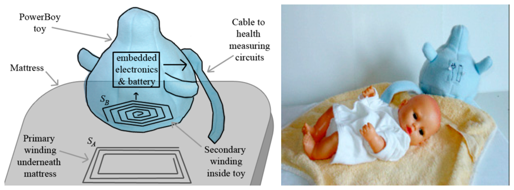 Reliable and continuous power supply for the sensors, micro-computers, signal amplifiers and transmitters used in wearable sensor systems is essential for the healthcare of infants. The power supply for health care systems should be non-invasive, inexpensive, reliable and rechargeable. There is already a variety of power supply systems in the marketplace, however almost all of these platforms were designed to run on batteries that have a very limited lifetime. The potential power sources for wireless sensor nodes may include batteries, micro-fuel cells, micro-heat engines, electromagnetic (RF) power, photovoltaics (solar cells), human power, wind/air flow, and thermal and mechanical energy sources [50,51]. The short-lived sustainability and high cost of power supplies is a significant limitation for wearable sensor systems in application. The power supply needs to continue to work for more than 1 day to be convenient. However, currently most batteries of the wearable sensor systems for continuous health monitoring on the market can only last nearly 2 h, or even less, which hardly meets the needs of users. In addition, the batteries which can last more than 4 h are usually very expansive. In order to minimize the maintenance and replacement costs of batteries, researchers have tried to develop innovative power solutions. Innovative materials, energy conversion and energy-scavenging technology (such as energy harvested from human sound, body heat and movement) have been taken into account in recent years to supply reliable power for wearable sensor systems. For example, Chen et al. proposed a wireless power supply system prototype for infants inside an incubator or in their parents' hug during Kangaroo mother care based on the principle of inductive contactless energy transfer [40]. The power supply design focuses on the contactless energy transfer system as well as the primary and secondary windings that generate the magnetic fields. As described on the left of Figure 18, when the PowerBoy plush toy is placed on the mattress above the primary winding, power is then transferred from the primary winding to the secondary winding through their mutual inductance. At the same time, the rectifier circuit and power converter charges a battery inside the toy, and supplies the monitoring equipment with power via a power cable inside the toy's fluffy tail. When the PowerBoy is lifted with the infant and the inductive link between the windings is broken, the circuitry inside the toy detects this and switches on the battery to power the monitoring equipment. As shown on the right of Figure 18, the Powerboy has aesthetic features and keeps some distance with the baby mannequin for non-invasive purposes, so this inductive solution for power supply has nearly no effects on the biomedical parameter (such as temperature) monitoring of infants.