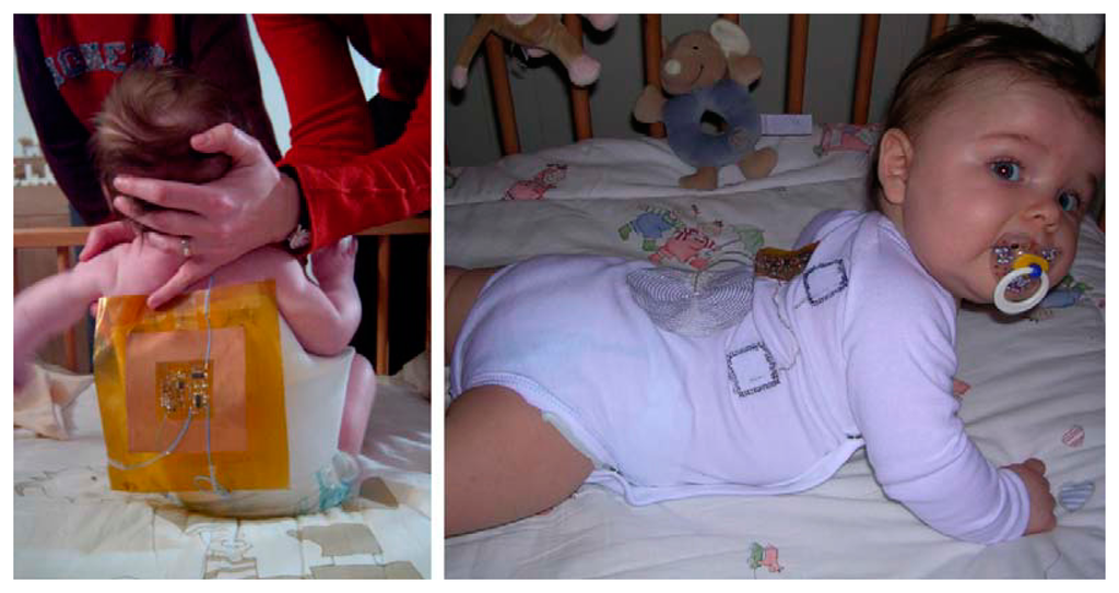 Health monitoring is an essential application of wearable sensor systems, especially for infants. Recently, together with advances in sensor techniques, wireless communication and power supply technologies, wearable sensor systems have enabled the creation of a new generation of constant health monitoring for infants. For example, a developed sensory baby vest including fully-integrated sensors for measuring electrocardiography (ECG), respiration, temperature and humidity (to detect excessive sweating), which allow the early detection of potential life-threatening events [9]. Conductive textile wires are used to make the sensors integration compatible in a prototype belt which is built of soft bamboo fabrics with a negative temperature coefficient (NTC) sensor to demonstrate temperature monitoring instead of hard wires in order to improve the comfort of the infant [10]. Sibrecht et al., developed a neonatal smart expandable jacket that enables ECG measurement by textile electrodes and carried out several experiments to demonstrate the prototype [11]. Another example is a wearable multi-parameter monitor named BBA bootee, developed to achieve the monitoring of infants at risk of apparent life threatening events (ALTE). The sensors, electronics and the power supply are integrated into the bootee, which provides reliable pulse oximetry measurements as well as useful information about the infant's movement and position [12]. Through detecting the variation in the exhaled CO2 concentration using CO2 sensors placed in the crib around an infant, clinicians are able to detect if there is anything unusual with the infant's respiration [13]. In Yamada and Watanabe's study, they tried to construct a prototype of a small pressure-sensor-driven round bar grip measurement device called DataGrip to measure the infant's grip strength. With this grip force measuring system, they drew the conclusion that the infant's grip strength increased in correspondence with physical development [14]. Dedicated design and non-invasive sensor integration are necessary for the wearable sensor systems to achieve safe and reliable health monitoring.
