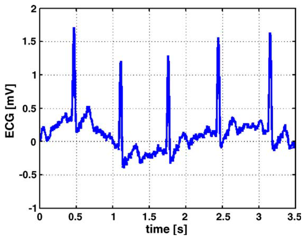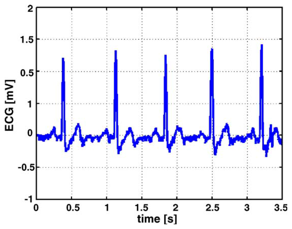 Figure 5 describes the ECG measurement in the same setup, except that it uses conventional electrodes instead of textile electrodes. From the comparison between the two test results, it is clear that the ECG signals measured with the textile electrodes display lower frequent base line drift, and the stability is lower than that of conventional gel electrodes. Nevertheless, textile electrodes can bring much comfort to the infants, and the signal quality is more than adequate for an accurate beat-to-beat detection of the heart rate, as demanded by the application [31].