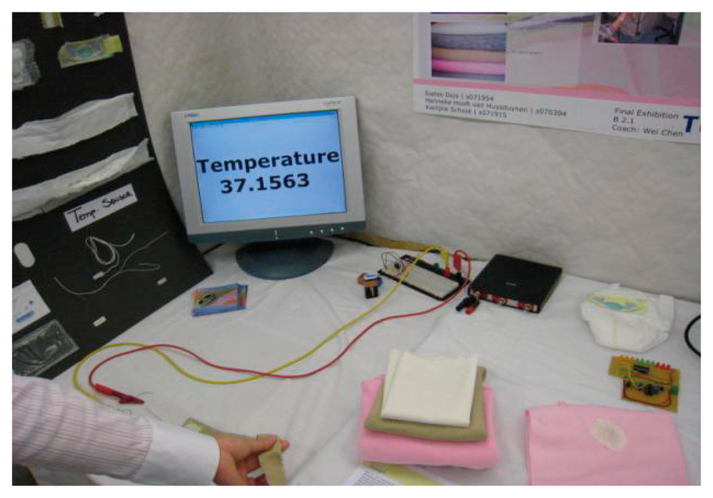 Body temperature is one of the key physiological parameters in infant monitoring. Traditional methods of temperature monitoring are mainly through thermometer, which is very inconvenient and cannot achieve long-term temperature monitoring for infants. Constant monitoring of temperature can be achieved by using various kinds of electrical devices, such as thermistors or thermocouples, as the sensing elements. The accuracy of the thermistors and thermocouples is very high, which can achieve ±0.5 °C and ±0.1 °C, respectively. In the past, the placement of these temperature sensors and the presence of all the electrical wires easily lead to discomfort and even painful stimuli when the sticky sensors have to be removed. However, with the development of integrating technologies, these temperature-sensitive devices are integrated into a neonatal monitoring platform or smart clothing for temperature measurement. For example, a negative temperature coefficient (NTC) resistor applied as a temperature sensor has been introduced in Dols and Chen's research work [10]. The belt is able to wrap around the infant's body to achieve temperature measurement in a comfortable way. The setup of the temperature monitoring demonstration of the belt, as shown in Figure 6, consists of the prototype belt, data processing circuit, digital oscilloscope and a PC as a display for the monitored temperature. The researcher held the sensor on the belt and the temperature of his hand was displayed on the screen immediately, which was very convenient and effective. As depicted in Figure 7, the prototype belt was placed around an infant's body in the NICU to test to see whether the signals from the belt remained stable for a longer period during continuous temperature monitoring; the soft conductive wires connect the NTC sensor with the external circuit. With the belt wrapped around the infant's body, clinicians can easily know the temperature changes in the infant according to the measured results displayed on the screen. Continuous skin temperature measurement requires the sensing device to keep good track of the patient. Alternatively, infrared pyroelectric detectors can easily take a rapid one-shot temperature measurement from the ear. However, the accuracy of the latter is much worse, which remains a major concern [32]. To achieve long-term and accurate monitoring of a baby's core temperature, most temperature sensors are integrated into infants' underclothes. The measurement of axillary temperature, oral temperature and rectal temperature is limited because it is invasive and could easily cause anxiety in the infant. Apart from thermistors and thermocouples, temperature-sensitive fiber sensors, which contain temperature-sensitive fluorescent materials, and pyroelectric detectors, which convert the changes in incoming infrared light to electrical signals, are becoming popular in temperature monitoring. These sensors can achieve an accuracy of ±0.1 °C.