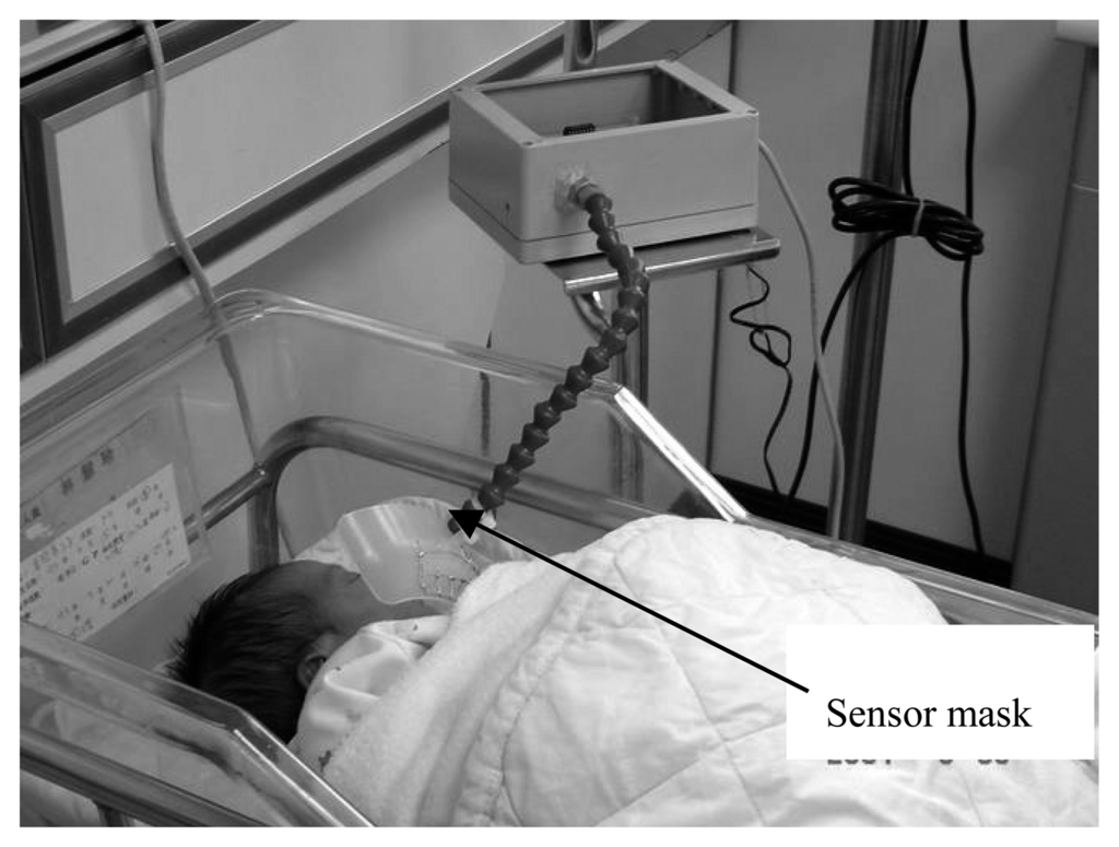 For the noncontact methods, some researchers made use of CO2 sensors placed around the crib on the bars to provide sufficient information about respiration [35]. There are many commercial off-the-shelf CO2sensors in the market with various sensing principles, such as electrochemical-based, infrared-based and metal-oxide-based sensors. The electrochemical based sensors give a better performance but have a short lifetime, and infrared based sensors are sensitive but bulky in size and more costly. The metal-oxide sensors are low cost but susceptible to the effects of temperature and humidity [13]. A thermal sensor-based respiration rate monitoring system was proposed in Hsu and Chi's work, which is another good example of a noncontact respiration monitor. Thermo sensors placed on the mask were sensitive to the temperature changes induced by respiration and the sensing data were collected and analyzed simultaneously by a personal computer, which can be linked to the central nursery room. As shown in Figure 8, by utilizing the thermo-sensors array, the sensor mask has the ability to perceive the temperature changes induced by respiration, and the ellipsoid-shaped mask was produced to avoid missing detection; it is also adjustable to accommodate different directions of the infant's face [36].