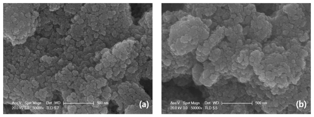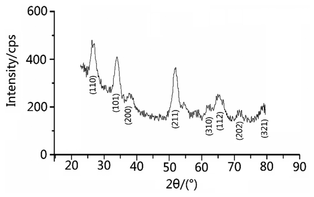 The products were characterized by scanning electron microscopy (SEM, JSM-6700F, JEOL Ltd., Akishima Musashino, Japan; 5 kV). X-ray power diffraction (XRD, Brucker D-8 Avance, BRUKER AXS GmbH, Karlsruhe, Germany, Cu Ka, λ = 1.5418 Å) analysis was conducted to characterize the products in the range of 20°–80°. The porous structure had been further confirmed by the Nitrogen adsorption–desorption analysis (Belsorp Mini, Ankersmid Ltd., Nijverdal, Netherlands). Figure 1 shows the X-ray diffraction (XRD) experiment map of the material. In the XRD pattern, we could barely see any characteristic peaks of any impurities. The fluctuation were possibly caused by noise in the instruments or minor impurities which could be ignored. Such a pattern shows that the SnCl2 have deformed to SnO2 nanoparticles.