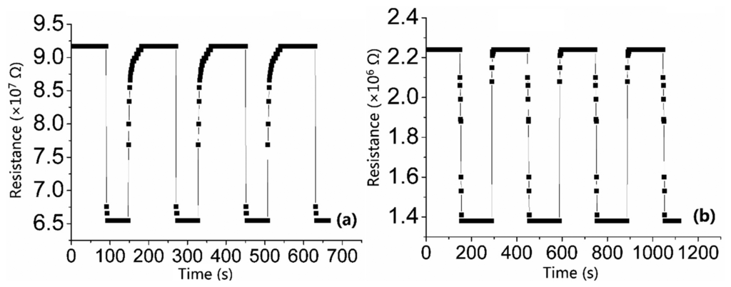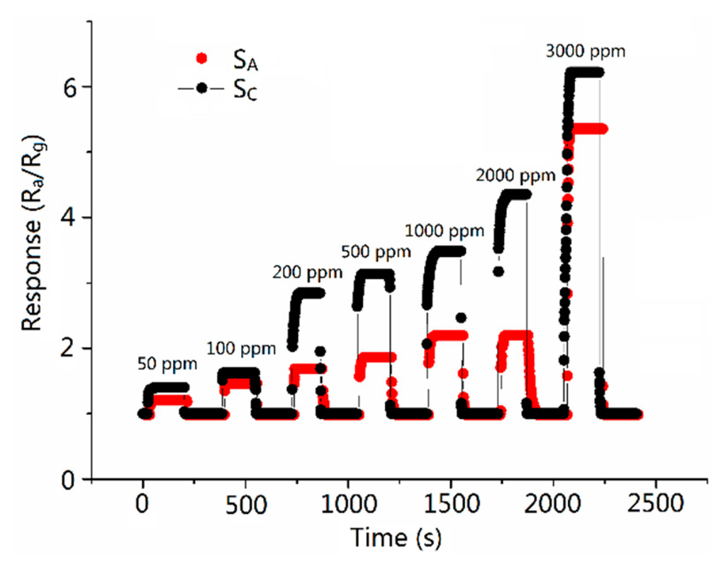 Stability and repeatability should also be examined for gas sensors in terms of practical applications. In Figure 10, the sensors testing atmosphere cycles between clean air and 50 ppm CO. The stable and repeatable characteristics can be reflected in the reversible cycles of response and recovery curves. Besides, as is mentioned in previous sections, SC has a shorter recovery time than SA. Figures 9 and 10 also indicate that “baseline drift” has nothing to do with the repeated tests.