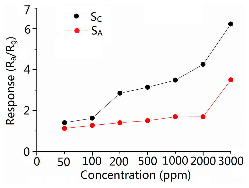 Figures 6 and 7 show the sensitivity of sensors versus the CO concentration ranging from 50 to 3000 ppm at the operating temperature of 300 °C. It is obvious that the sensitivity increases when the concentration increases and the response of SC is higher than SA in the all test ranges of CO concentration. The response of SC toward 500 ppm CO reached the value of 3.13, which is about 2.1 times higher than the response of SA. Table 2 shows the response time of 2.6–12.2 and 3.012–15.875 s (the response/recovery time is defined as the time the sensors take to complete 90% of total signal change), and recovery time of 3.6–14.8 and 3.7–16.4 s at various CO gas concentrations for sensors SC and SA, respectively. It is obvious that SC has a shorter response/recovery time compared with SA at various CO gas concentrations. The shortened response/recovery time and the promoted sensitivity show that because of the design of the molecule imprinting mechanism, the response performance of the sensors has been remarkably improved. Moreover, our research focuses on inventing a new path (borrowing the mechanism of the molecular imprinting method) in improving semiconductor sensors' sensing performance. Therefore, the mechanism can be applied to various kinds of nanomaterial. No matter which method the CO gas semiconductor sensor has previously used, adopting our method can further promote the sensing ability of the sensors.