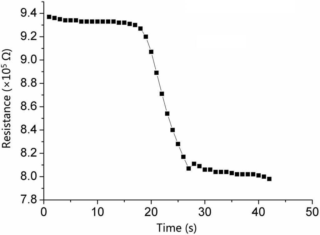We also examined the detection limits of the sensors. Detection limit is the minimal detecting gas concentration that acted on the sensors. It is another vital factor determining semiconductor sensor's performance [31,32]. In Figure 8, there is a distinct response at a CO concentration of 5 ppm, while at lower concentrations, we can barely see the resistance change. Therefore, we assert that the detection limit of gas concentration is 5 ∼ ppm.