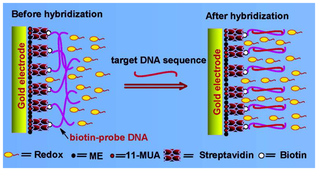 Avidin and streptavidin are large tetrameric proteins containing four identical biotin-binding sites that can be used for forming tetravalent avidin/streptavidin-biotin bonds in order to develop DNA-coated electrodes; in these electrodes, surface-confined avidin/streptavidin reacts with biotinylated DNA [98]. Because of the innate aqueous immobility of the avidin-biotin complex, this system is easy to use. Pan et al. generated a mixture of self-assembled monolayers (SAMs) by using 2-mercaptoethanol (ME) and 11-mercaptoundecanoic acid (MUA) on an Au electrode and attached a DNA probe to the activated MUA through streptavidin-biotin chemistry, as shown in Figure 2 [99]. Caruso et al. employed the quartz crystal microbalance (QCM) technique in order to immobilize biotin-DNA on an avidin-modified QCM electrode [100]. Several strategies have been developed for attaching biotin to modified CP electrodes, including the biotin-sandwich technique for immobilizing DNA [101–106]. Guillerez et al. designed a DNA sensor by using an electropolymerized biotinylated-PPy film [101]. Biotinylated DNA probes were immobilized onto PPy-biotin films through an intercalated layer of avidin (PPy-biotin/avidin/DNA probe). Furthermore, to detect DNA hybridization, fluorescently labeled or non-labeled avidin and biotinylated DNA probes have also been immobilized on a biotin derivative (photobiotin)-modified poly(dimethylsiloxane) (PDMS) chip by using biotin/avidin/biotin chemistry [106].