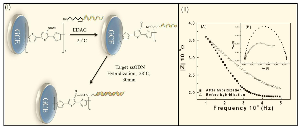 PTh and functionalized PTh demonstrate a variety of remarkable solid-state properties and hold tremendous potential for use in molecular electronic devices, solid-state batteries, and sensors [144,145]. Carboxylic acid- and ester group-functionalized PTh polymers (e.g., 3′-carboxyl-5,2′,5′,2″-terthiophene, poly(thiophen-3-yl-acetic acid 1,3-dioxo-1,3-dihydro-isoindol-2-yl ester) (PTAE), and 3-((2′:2″,5 ″:2‴-terthiophene)-3″-yl) acrylic acid (TAA)) have been widely used for developing electrochemical DNA sensors [146–149]. Lee et al. used a poly(3′-carboxyl-5,2′,5′,2″-terthiophene)-modified GCE and reported that only a short hybridization time (1 h) was required [146]. The amine group linked to the 5′ end of the DNA probe (a 19-mer) was covalently attached with the carboxyl (-COOH) group-terminated polymer, which corroborated the hybridization of the target DNA (Figure 3I). The hybridization of fully complementary target DNA induced a significant decrease of the impedance values (Figure 3II). The difference in impedance values before and after hybridization of target DNA can be ascribed by the change in conductivity and capacitive current. This method is more advantageous than other methods because of its selectivity, short response time, and minimal use of intercalators and fluorescent tags. Cha et al. described a synthetic route for thiophen-3-yl-acetic acid 1,3-dioxo-1,3-dihydro-isoindol-2-yl ester (TAE), which can be readily electropolymerized on a Pt chip electrode and allow for the direct substitution of its exiting group with a prosthetic group that contains a terminal amino group on the DNA probe [149]. The sensitivity of this sensor was 0.62 μA/nmol and the detection limit was 1 nmol.