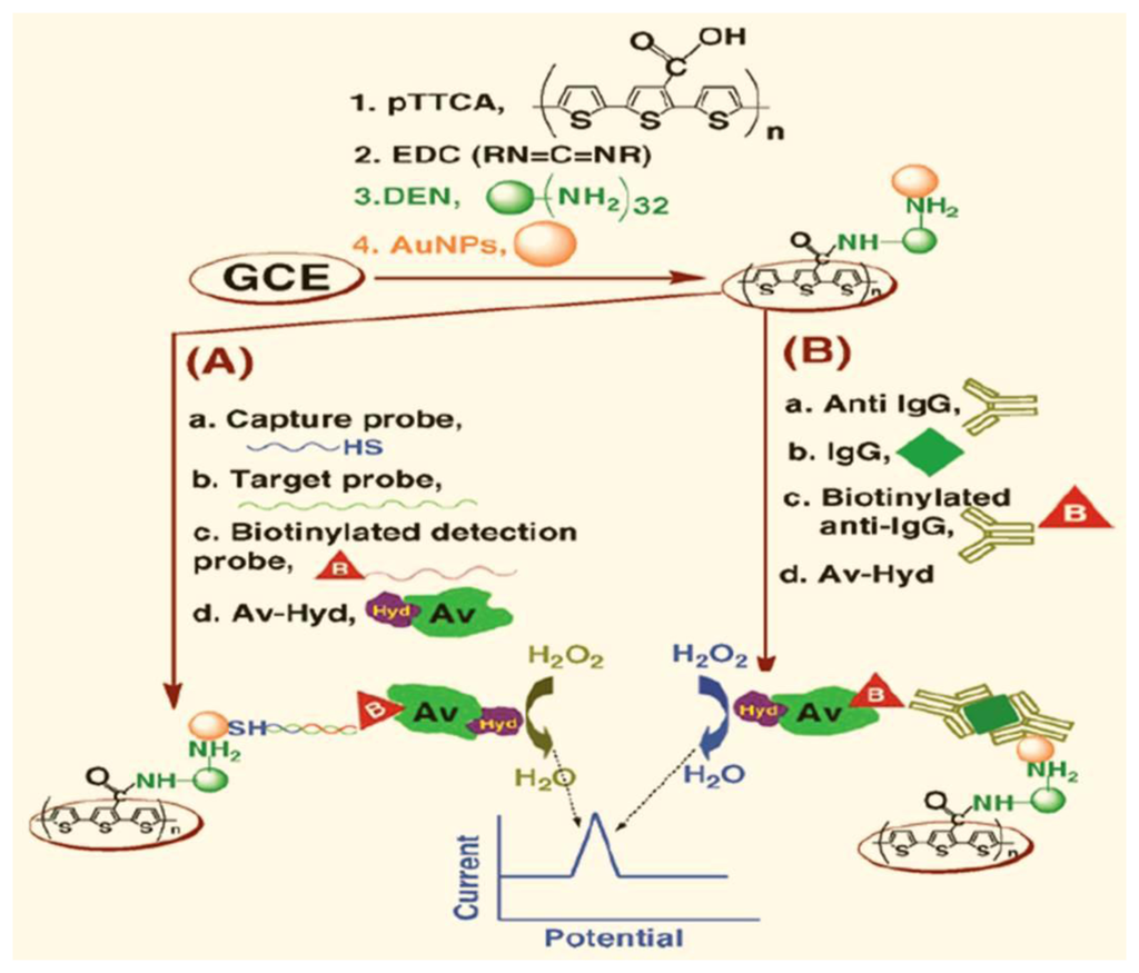 Considerable emphasis has been placed on producing portable and inexpensive devices for DNA detection because of their importance in forensics, medical diagnostics, and evolutionary studies [150–153]. Shiddiky et al. developed an ultrasensitive technique for detecting DNA and proteins based on poly-5,2′:5′,2″-terthiophene-3′-carboxylic acid (pTTCA) (Figure 4) [154]. Dendrimer (DEN) and hydrazine were covalently linked to the pTTCA film and the signal was amplified by the pTTCA/DEN assembly loaded with Au nanoparticles (AuNPs). The target DNA- or protein-linked hydrazine labels (avidin-hydrazine) adsorbed onto the pTTCA/DEN film, and DPV measurements revealed a linear dynamic range for the electrocatalytic detection of DNA and protein. The simplicity, low detection limit, and reproducibility (RSD < 4.3% for n = 10) of the sensor make this a promising tool that can be developed in the future for practical applications.