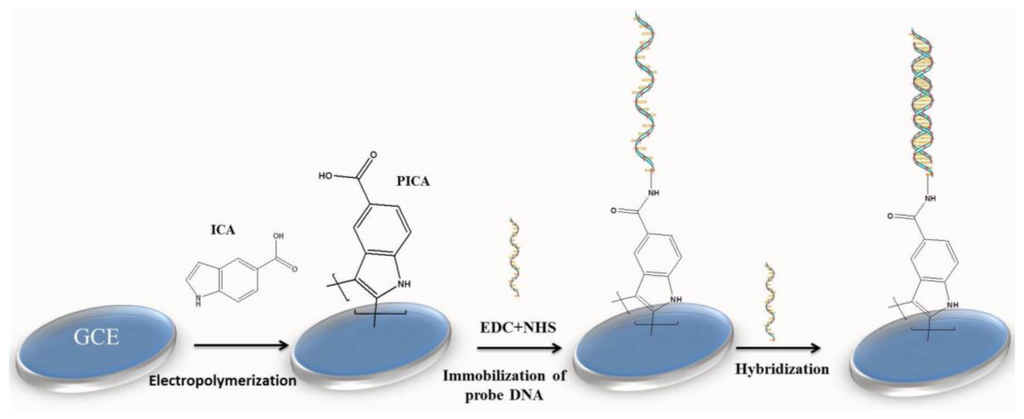 Poly(triamine) (PTyr) contains one primary aliphatic amine per triamine moiety, which represents an extremely high concentration of surface reactive sites for biomolecule immobilization [184]. Tran et al. first prepared a PTyr film by electrooxidizing 4-hydroxiphenylethylamine in perchloric acid, which left one reactive amine group per moiety [185]. DNA was immobilized on the polymer film through a phosphoramidate covalent bond [186], and this yielded a high surface concentration of DNA (∼500 pmol/cm2). DNA can also readily bind to PTyr through nonspecific adsorption, and thus differentiating between adsorbed and covalently bonded DNA could be challenging. However, DNA probes that were weakly adsorbed were removed by washing with SL salmon-testis DNA. The remaining covalently bonded DNA probes were used for the hybridization of GEM DNA, a complementary DNA sequence derived from HIV gag protein. For detecting DNA hybridization, Li et al. prepared a new type of conjugated CP, poly(indole-5-carboxylic acid) (PICA), on GCE by means of anodic oxidation (Figure 7) [187]. PICA exhibited optimal electrochemical behavior and thermal stability, with a conductivity of 10−2 S/cm and high redox activity compatible with the concept of molecular-wire transduction. The PICA-modified sensor showed comparable sensitivity and its detection limit was 1.0 nM, which can be further improved by increasing the side chain length because longer side chains permit greater freedom of movement and more enhanced hybridization [35].