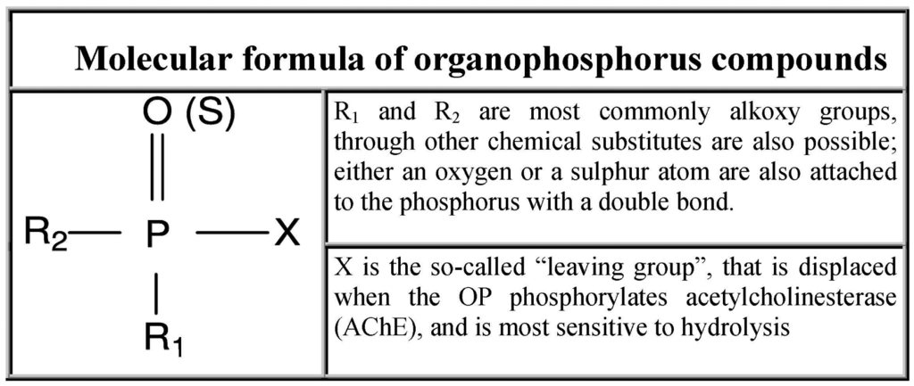 Organophosphate (OP) compounds are ester, amide or thiol derivatives of phosphoric, phosphonic or phosphinic acids. Their general formula is shown in Figure 1. These compounds act as irreversible inhibitors of acethylcholinesterase (AChE) that catalyzes the hydrolysis of acethylcholine (ACh), the most important neurotransmitter in the central and peripheral nervous system [1,2], thus affecting the transmission of nerve impulses.