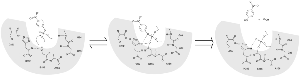 EST2 is a carboxylesterase belonging to the hormone sensitive lipase (HSL) family that includes several AChEs. This enzyme shows a very long time stability and an appropriate resistance and activity at different pH values and temperatures, [39–41] as well as a good stability in the presence of low concentrations of organic solvents and detergents [42,43]. Furthermore, the EST2 3D structure has been solved at 2.6 Å, [44,45] giving the possibility of having a model structure for in silico studies such as molecular docking predictions. EST2 interacts with paraoxon in a similar way to the substrate (Figure 2), but the covalent intermediate of reaction is too stable to dissociate, so irreversibly inhibiting the enzyme.