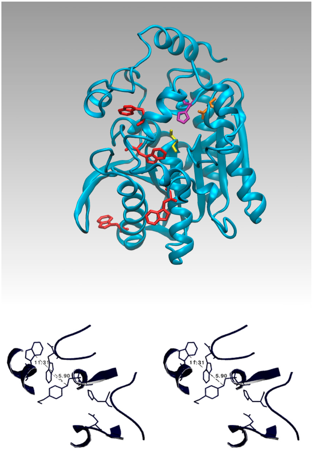 The fluorescence quenching of tryptophan rapidly decreases if the quencher distance increases over 7–8 Å from the centroid of the indole ring of the tryptophan residue, as has been clearly described in literature [54]. Therefore, a contribution of a single tryptophan residue to the intrinsic fluorescence quenching of EST2 after covalent binding with inhibitors appears possible from the structural analysis.