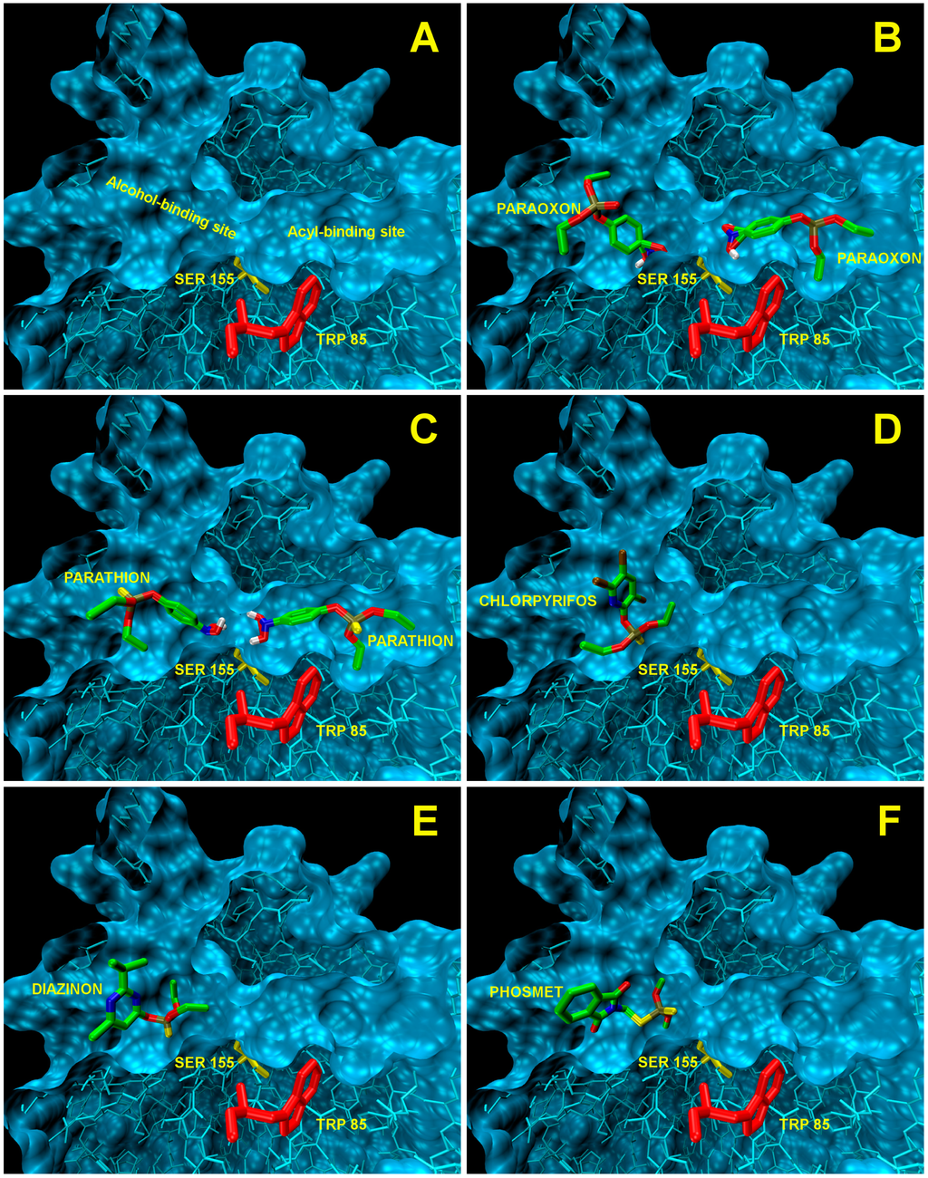These observations are useful to explain the results obtained in the fluorescence measurements, linking the presence of a second paraoxon molecule in the alcohol-binding site to the increase in fluorescence quenching over the EST2-paraoxon stoichiometric ratio 1:1.