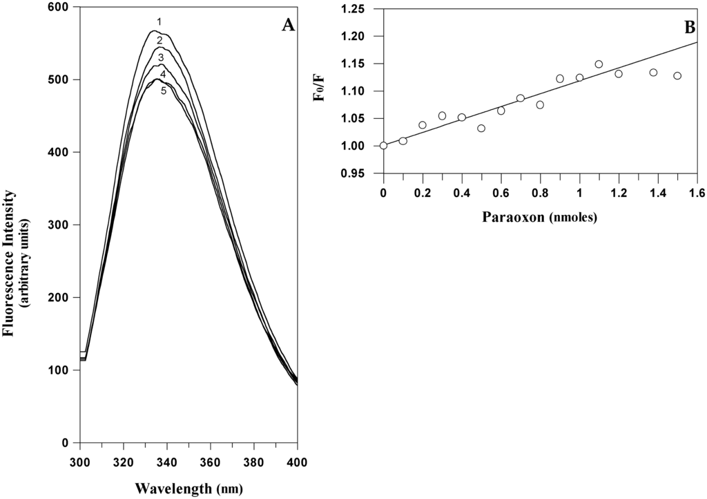 Starting from this hypothesis it could be feasible to quantitatively measure the amount of paraoxon bound to EST2 by a direct measurement of the protein fluorescence. The typical fluorescence emission spectra of EST2 in the 300–450 nm wavelength range, after excitation at 280 nm, showed a maximum at 340 nm (Figure 5A). As expected, the addition of paraoxon to the enzyme solution decreased the fluorescence intensity (associated with the tryptophan quenching) without changes in the wavelength values of the maximum of emission (Figure 5A). These results indicated that the micro-environment of the tryptophans does not change, and therefore we could exclude the possibility of non-specific interactions and associate the fluorescence quenching to a simple steric bulk of the inhibitor in the catalytic site. These data support the structural evidence of a direct effect of the inhibitor on the local fluorescence emission of tryptophan residue 85 neighboring the active site of EST2.