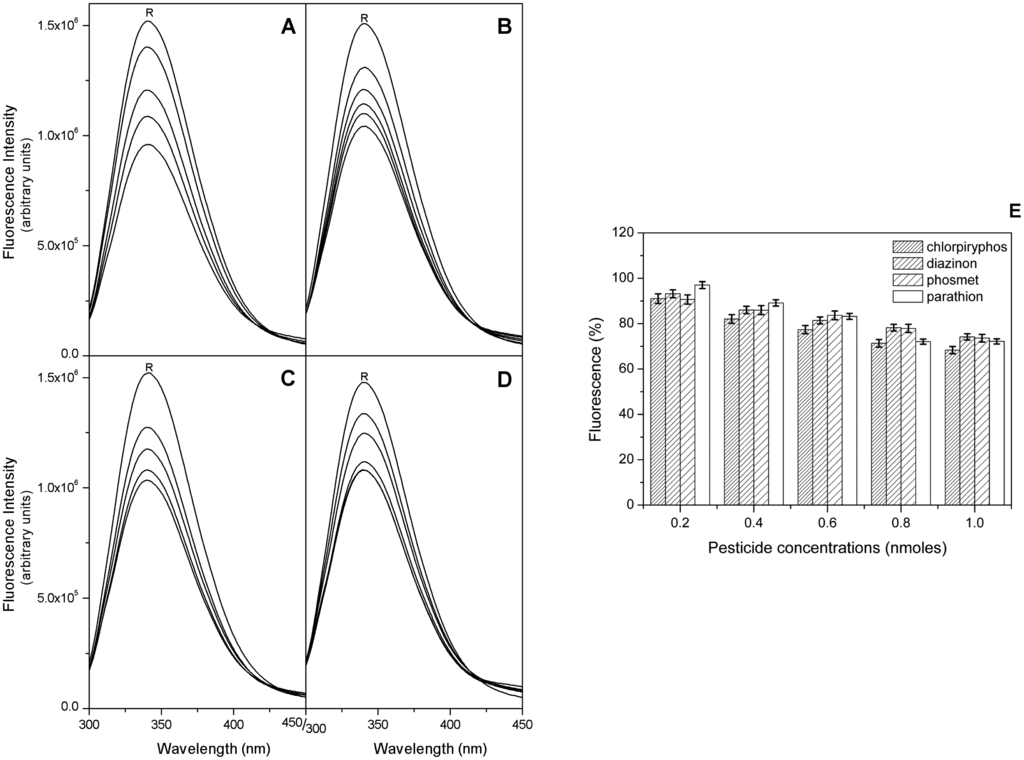 These results support the evidence that several compounds belonging to the OP family are recognized by EST2, although only a few of them succeed in inhibiting the enzyme thanks to their chemical-physical characteristics, suggesting that the intrinsic fluorescence could be a powerful methodology for pesticide detection.