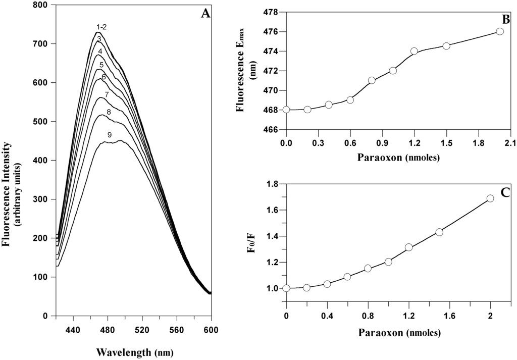 Fluorescence emission spectra of the ANS-EST2 complex in the range 420–550 nm, excited at 350 nm, showed a maximum at 468 nm (curve 1 in Figure 8A). The addition of paraoxon aliquots to the complex decreased the fluorescence intensity (Figure 8A) and produced a red shift in the maximum of emission (Figure 8B). The observed modifications in the ANS emission spectra did not express the expected variations if only the active site cavity was involved. In particular, when plotting the F0/F ratio of the fluorescence intensity at the maximum emission of the ANS-EST2 complex versus the different paraoxon concentrations (Figure 8C), the data plot does not reach a plateau at the stoichiometric ratio 2:1 inhibitor/enzyme. This result suggests that the addition of paraoxon and/or the release of the phenol alcohol could cause an increase of the environment polarity, so modifying the fluorescence spectra of ANS in solution, and making impossible a direct determination of paraoxon by this approach. However, the red shift observed in the wavelength of maximum emission suggests different kinds of interaction. In the range of concentrations from 0 to 0.6 nmoles of paraoxon (1:1 stoichiometric ratio inhibitor/enzyme), we observed a slight shift of the value of maximum emission, that increases until 1.2 nmoles of paraoxon (2:1 stoichiometric ratio inhibitor/enzyme), reaching a plateau for higher paraoxon concentrations (Figure 8B).