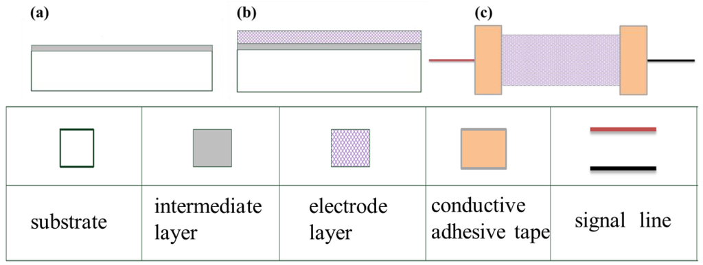 For the flexible sensor fabricated in this study, artificial skin (PAUL HARTMANN Limited, Heywood, UK) that consists mainly of hydrophilic colloids and adhesive polymers was used as the substrate. The flexible sensor was fabricated by sputtering a thin film of silver on the substrate. The parameter settings of the radio frequency (RF) sputtering machine are shown in Tables 1 and 2. Figure 1 shows the fabrication process of flexible strain sensor. Chromium was first coated as an interlayer on the substrate to increase the adhesion between the electrode layer and the substrate (Figure 1a). Subsequently, silver was coated as the electrode layer (Figure 1b). Finally, the signal line is connected with the electrode layer by conductive adhesive tape. The statistical size and dimensions of the sensor are shown in Table 3.