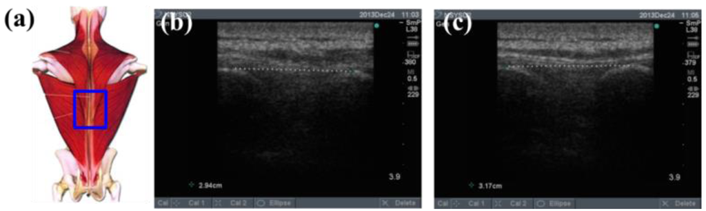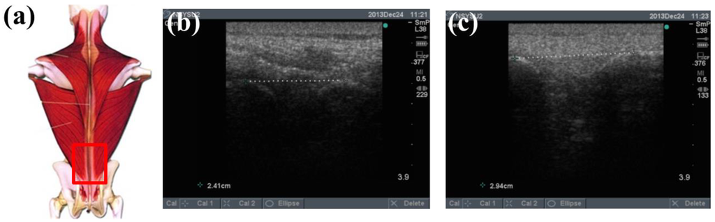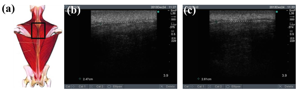 To determine the feasibility of the training system proposed in this study, we used ultrasound imaging to observe the muscles' length changes during contraction and determined whether these changes were correlated with skin stretches. Ultrasound image measurement is used for exploring the human body, such as observing tissue structure, blood or tissue movement, and the mechanical characteristics of tissues. Tissue structure is mainly observed using grayscale images. The primary principle in ultrasound imaging is the reflection of ultrasound waves when the waves encounter different density interfaces in the human body. The piezoelectric crystals in the sensor head receives the signals and converts the signals into images according to the direction, distance, and strength of the waves. Ultrasound imaging is often used to examine tumours, tissues, or organs inside the body. Moreover, ultrasound images are also usually used to exam the muscle and soft tissue in rehabilitation and orthopaedic departments [12–16]. The SonoSite Titan ultrasound system (FUJIFILM SonoSite, Inc, Bothell, WA, USA) was used to measure the muscle length changes during exercise. The trapezius, mid erector spinae, and lower erector spinae were measured. The ultrasound image of the muscles at different trunk angles during Roman chair back hyperextension training is shown in Figures 10, 11 and 12, the (b) component showed the image in the preparatory actions and (c) component showed the image in the flexion 45 degrees. The muscle length in the specific positions is shown in Table 6. The lower erector spinae shown in Table 6 had a muscle shortening length of 0.53 cm (the largest length change). The test position correspond to skin stretch of 20%–35%, as shown in Figure 3b, was the largest change among the three positions. The results showed that during Roman chair back hyperextension training, changes in back skeletal muscle extension length exhibited a positive correlation changes in skin stretch. Therefore, the feasibility of a proof of concept sensor has been demonstrated.