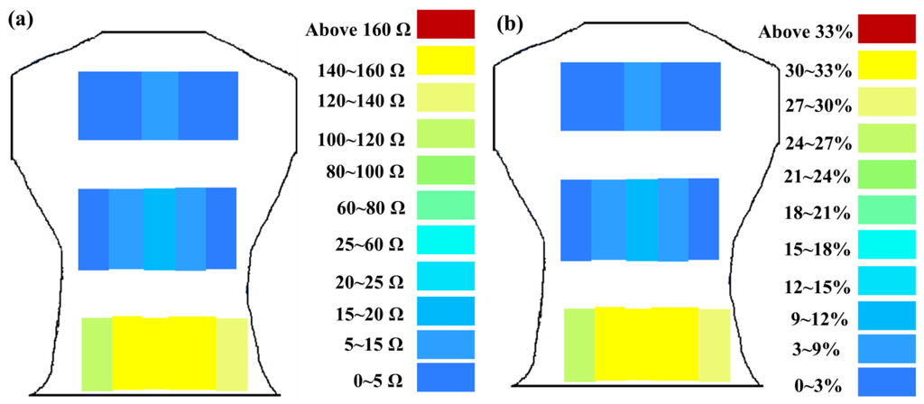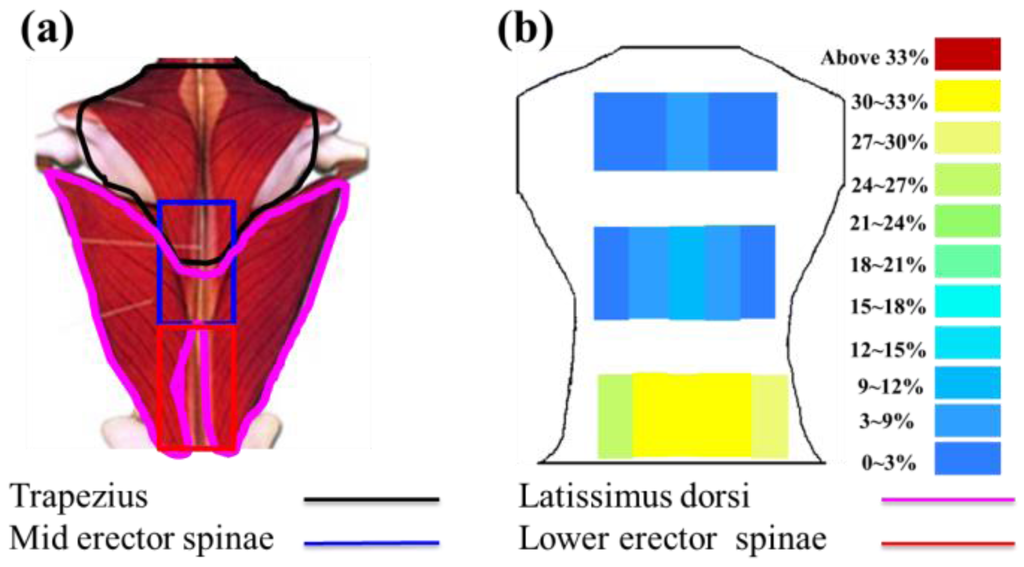 The greater the resistance changes measured by sensors, the greater the changes in skin stretch. The resistance changes measured by flexible sensor arrays are shown in Figure 13. Figure 13a shows the resistance change measured by flexible sensor arrays and Figure 13b shows the skin stretch. The similar changes pattern of Figure 13a,b conform to the concept of Roman chair hyperextension training, which trains the lower erector spinae primarily, this position also yielded the greatest resistance change. The latissimus dorsi and mid erector spinae also have training effect and yielded the second highest resistance change. While the trapezius had least training effect and yielded the smallest. It demonstrates that resistance changes measured by flexible sensor arrays had a positive correlation with skin stretch.