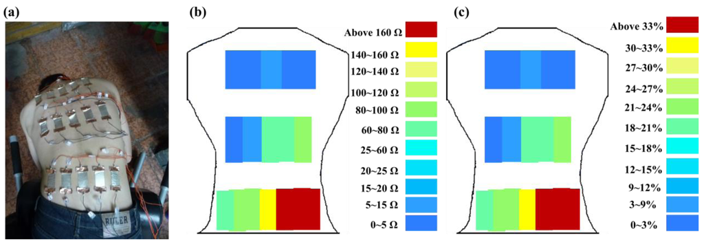 Figure 14b,c shows the resistance changes of flexible sensor arrays and corresponding skin stretch during Roman chair back training while incorrect posture (side bending posture) (Figure 14a). Comparison of Figures 13 and 14 shows that when the training position was incorrect, the resistance changes on the two side spine muscles were clearly asymmetrical. Furthermore, the greatest change primarily occurred in the muscle training range (the lower erector spinae). This position had the highest resistance changes, the latissimus dorsi and mid erector spinae had the second highest resistance changes, and the trapezius had the smallest. It demonstrates that resistance changes detected by flexible sensor arrays can show whether Roman chair back training movements are correct or not.