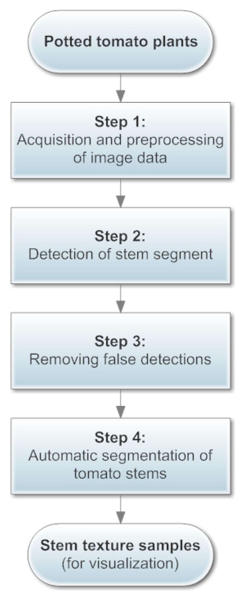 As a fundamental structure in plants, the stem system is important to plant taxonomy and growth monitoring. Detection and recognition of plant stems has becoming an essential part of many automated computer and electronic systems applied in agriculture (e.g., robotic harvesting systems). Therefore in the digitization of greenhouse tomato plants, we focus on stems by using a Kinect as the sensing instrument, and propose a four-step automatic stem digitization scheme (Figure 1). First, the Kinect is used to capture both color and depth information of a tomato plant in Step 1. Then in Step 2, linear features of the plant images are detected and regarded as candidate stem segments. In Step 3, a histogram-based thresholding algorithm on a grid system is applied to decide an accurate region in which the main stems congregate, so as to eliminate false candidates in the canopy and the pot regions. Finally, stem texture samples are segmented and stored for further usage (e.g., visualization) in Step 4.