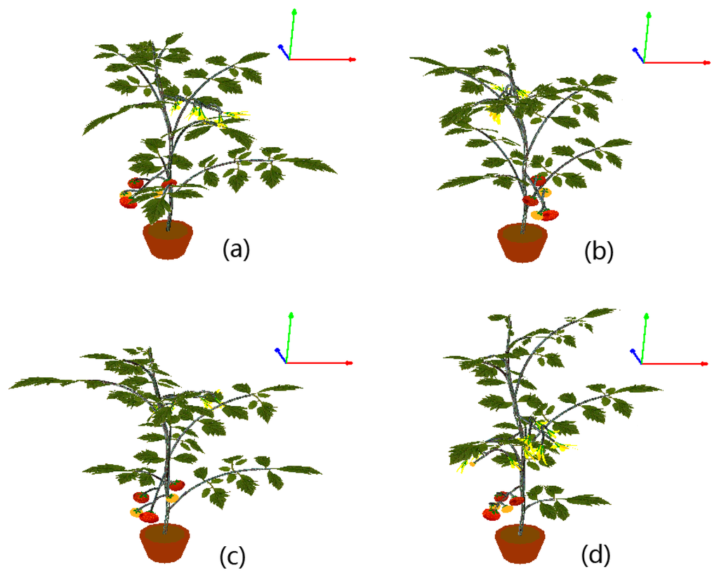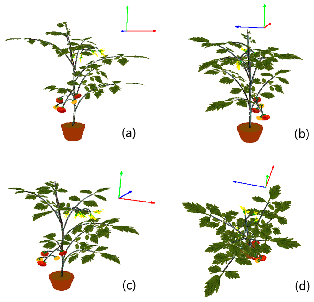 To make the modeled plants as real as possible, some subtle adjustments are carried out. For example, the main stem is generally not strictly straight due to uneven distribution of lateral branches that place different weight loads on the main stem. Therefore, in the proposed L-systems, the direction of the main stem is altered slightly at each step of the plant’s growth. Another example is that we observed that the lateral branches on a real plant bend downward because of their innate fragility. Therefore every branch is artificially bent downward in our virtual models, and the longer a branch is, the more curvature it will exhibit. Leaves are not reconstructed as planar objects in our visualizations; the Bezier surface is adopted to simulate the natural shape of each leaf instead. To better display the details of our visualization results, a virtual ordinary tomato plant is displayed at several different viewing angles in Figure 10.