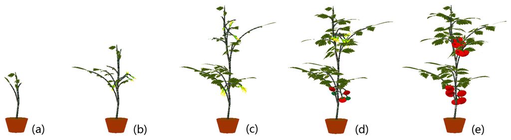 By bringing an age parameter into an L-system, development of the whole life-span of all organs and components of the plant can be reproduced and realized. Furthermore, parameter-dependent conditions can be designed and incorporated into L-system productions to provide sophisticated and particular controls on symbols, which—in the end—constrain the growth process of the virtual plant. In our approach, the age parameter normally takes on integer values starting at 0. The values of a symbol’s age increase by 1 at each consecutive stage of growth. There is also a special state “r” for the age parameter (specified in Table 1). A virtual growth process of a cherry tomato plant is displayed in Figure 11, and growth visualization of an ordinary tomato plant is shown in Figure 12.