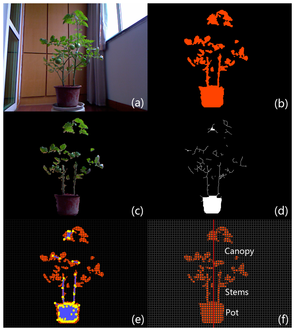 Stems are linear segments that are interconnected as a skeleton in the plant structure. Many powerful algorithms have been designed for extracting skeletons composed of stems from 3D/2D structures or surfaces [53,79,80]. Though these methods can tolerate outliers and noise to a certain degree, they assume without exception that the object structure is dense and well connected. In our case, the digitized image of the tomato plant is sparse and fragmented, as seen in Figure 2c. Therefore, we resort to a simpler but more reliable 2D algorithm [81] to extract skeleton from the aligned depth image, because of its fast speed and its capability of handling fragmented structures. The result is shown in Figure 2d.