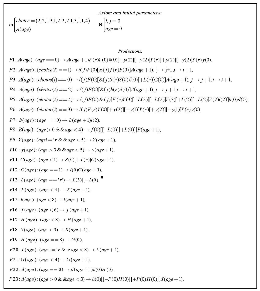 In Equation (9), the word pred is on behalf of the predecessor symbol before recursion and succ is the successor symbol after recursion, with both of them controlled by real-valued parameters. The word cond stands for a condition with respect to values of parameters associated with pred. The production holds if and only if the three following requirements are satisfied simultaneously: (1) The actual symbol in the L-system string is the same as the formal symbol pred; (2) The number of actual parameters appearing is the same as the number of formal parameters of pred; (3) The parametric condition that is formulated by cond is met. During a recursion, each actual symbol in the axiom string is examined vis-a-vis the three requirements, and if a corresponding production holds, then that particular symbol is replaced by the symbol given by succ.