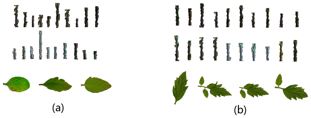 Leaf samples are directly digitized from images of several leaves by applying color-based segmentation on them against a uniform background. Some stem and leaf texture samples of the cherry tomato plant are given in Figure 5a, while some stem and leaf texture samples of the ordinary variety are displayed in Figure 5b. It should be noted that several compound leaves are included in Figure 5b.