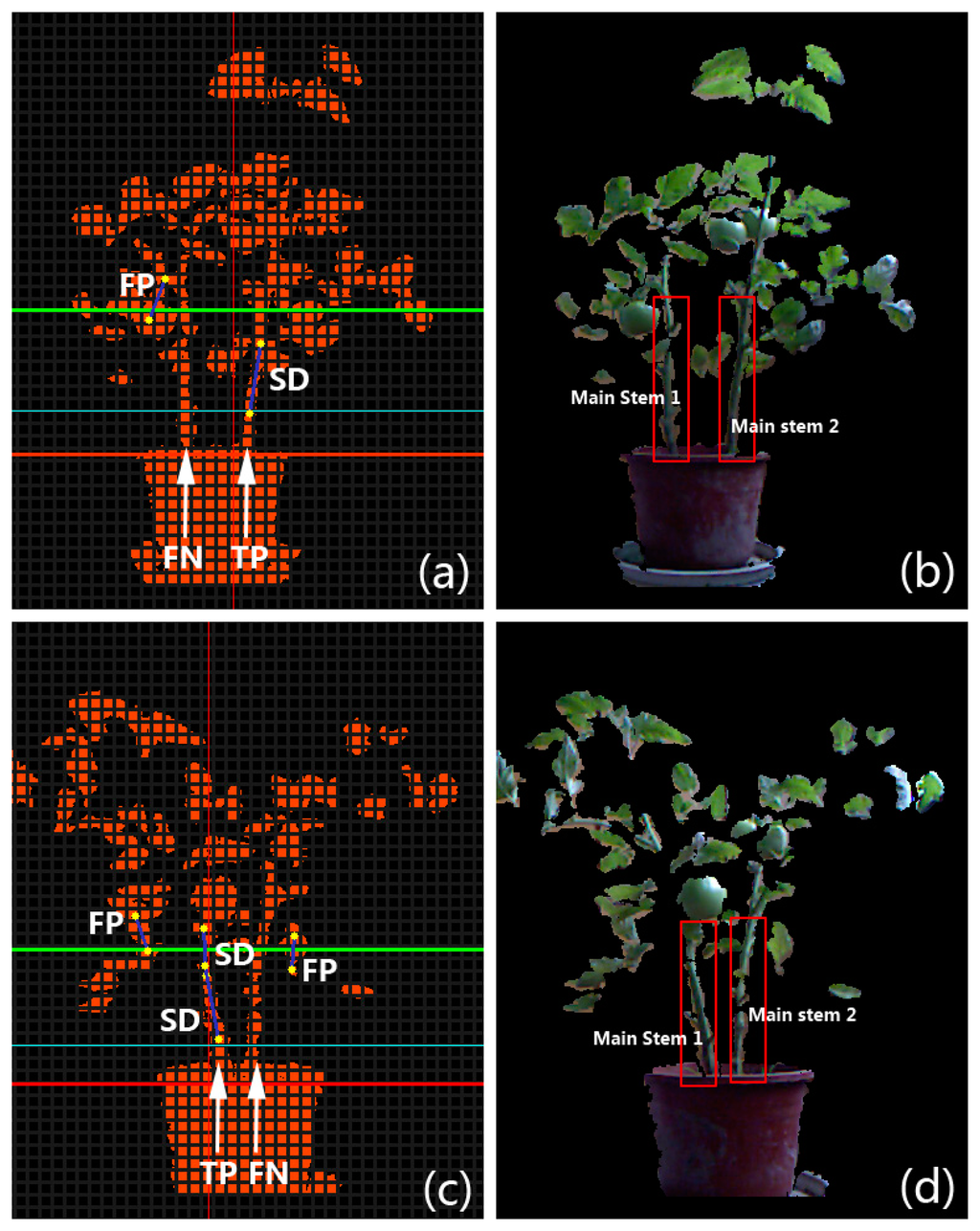 In order to evaluate the performance of the proposed stem segmentation algorithm in a quantitative way, several metrics are introduced. If a main stem of the plant is not covered by any detected segments produced by the algorithm in the bounded valley region (e.g., the region between the green dashed lines in Figure 3e) of a test image, we consider it is a False Negative (FN). On the contrary, if there exists one or several detected line segments that cover a part of the main stem, a True Positive (TP) is counted for this main stem. False Negative Rate (FNR) is defined as the ratio of the number of FNs in a batch of test images to the total number of main stems counted manually from test images. True Positive Rate (TPR) is defined as the ratio of the number of TPs in a batch of test images to the total number of stems counted manually. It is easy to find out that for the same set of test images, the sum of TPR and FNR is 1. In the set of extracted stem segments acquired from our algorithm, a segment that is not located at the position of a true main stem is treated as a False Positive (FP). In contrast, a Successful Detection (SD) stands for an extracted stem segment that is located on the true main stem. Error Rate (ER) is defined as the ratio of the number of FPs in the set of extracted segments to the total number of the extracted segments, and Accuracy (Ac) is the ratio of the sum of SDs in the set of extracted segments to the total number of the extracted segments. The value of accuracy can also be computed by subtracting ER from 1. To intuitively demonstrate how we count FN, TP, FP, and SD in experiments, two examples on the ordinary tomato plants are given in Figure 6. All four tomato crops were planted and observed in a growth period of about 85 days; however, because the stems are too thin to be captured by the Kinect when plants are young, the stem digitization algorithm wasn’t applied on those crops until they stepped into the stage of rapid development.