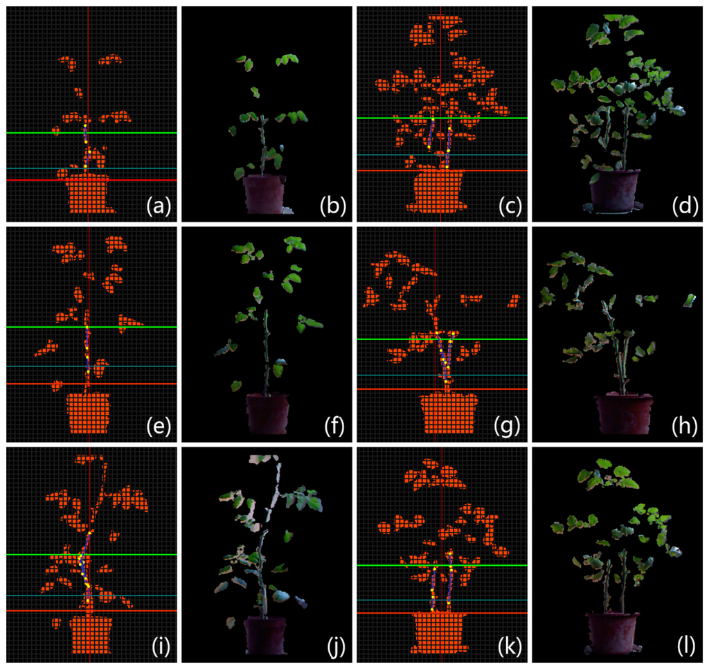 Although the data acquisition is based on the Kinect, the proposed stem segmentation scheme is potentially capable to be utilized with various 3D imaging sensors or stereo-vision systems that have higher precision but are often more expensive. The proposed stem digitization method can also be applied to many other species of plants to extract texture samples, as long as they are potted. The detection results on a potted sweet-pepper plant (Capsicum annuum) and a potted Jerusalem cherry (Solanum pseudocapsicum L.) are shown in Figure 14, in which all the main stems are well detected and labeled. The “fat-thin-fat” assumption may not hold for the plant that grows along a vertical wire in some greenhouses, so the proposed scheme may fail. Nevertheless, in such a case we can separate the image of the whole plant into several parts along the direction of the wire and then try to capture the “fat-thin-fat” feature in each single part. And finally, the stem segments of the plant can be detected at several different heights. The core of our visualization is the procedural plant models—i.e., the two parametric L-systems. As the L-systems are summarized from real tomato plants, the proposed visualization scheme is currently only suitable for modeling and simulating tomato plants. Extension to other plant species requires procedural models summarized from individuals of those species in the real world.