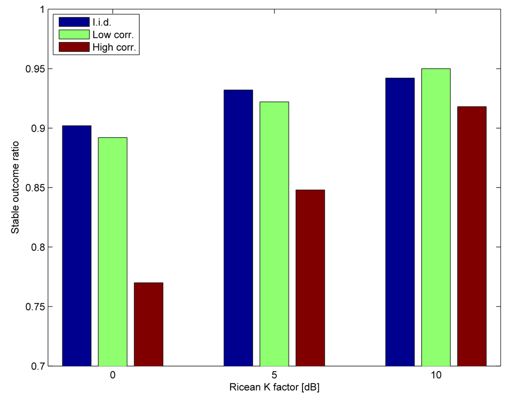 We consider a non-redundant routing scenario, i.e., only Nodes 7, 5, 3 and 2 are activated. The deadline is set to six time slots (60 ms), such that every link can be activated twice (e.g., 7 → 5, 5 → 3, 3 → 2, 7 → 5, 5 → 3, 3 → 2). The successful delivery ratios are shown in Figure 9. As expected, the low correlation channel and the i.i.d. channel perform similarly, whereas the delivery ratios are adversely impacted in the highly correlated channel, with diminishing impact as the Ricean K factor increases. Figure 10 shows the ratio of stable outcomes under the same assumptions. The stable outcome ratio closely follows the successful delivery ratios.