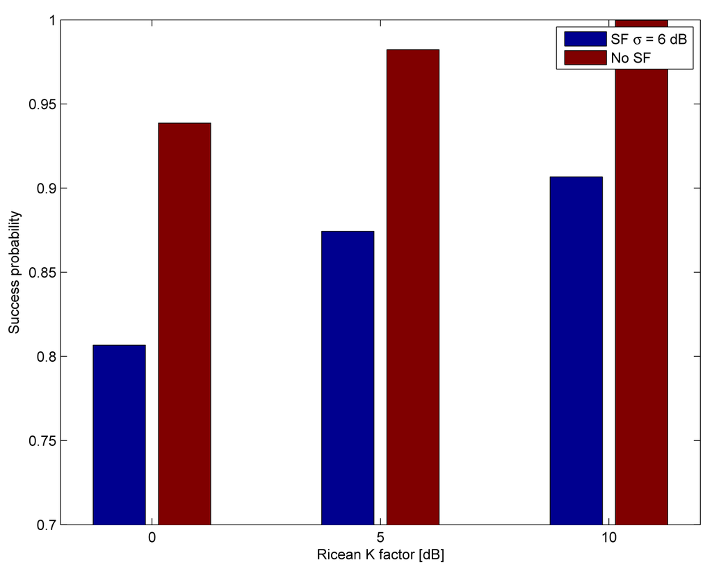 Finally, we compare the effects of the shadow fading on the success rates and the stable outcomes by disabling the shadow fading compared to the parameters in Table 1. We only show the outcomes for the highly frequency-correlated channel. The success rates and the ratio of stable outcomes are shown in Figures 11 and 12, respectively. Increasing the standard deviation of the shadow fading deteriorates the performance considerably, although it yields to the same improvement or the decrease of the link budget with the same probability High frequency correlation and high shadow fading correlation together cause the largest degradation in performance.