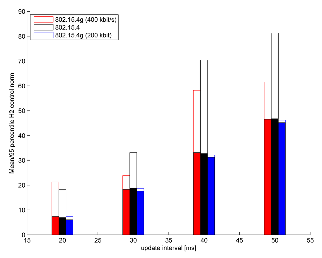 In this part, we demonstrate the ability of the simulation framework to compare different physical layer options. In particular, we run the batch reactor benchmark over both legacy 802.15.4 PHY and over two different 802.15.4 g-based PHYs (both the 200-kbit/s and 400-kbit/s modes) and compare the ratio of stable outcomes between the two simulations. All of the simulation parameters are identical to those in Table 1; only the K-factor is increased to 10 dB, making the channel fading less pronounced. The quadratic control error (with respect to the impulse response of the delay-free feedback loop with a 10-ms sample interval) is shown in Figure 13 for the high-correlation flat fading channel, for sample intervals between 20 ms and 50 ms. Unstable outcomes are excluded from the mean error calculation, but we provide the 95th percentile error over all 100 independent drops. The 802.15.4 g 200 kbit/s PHY outperforms the other two PHYs; the feedback system remained always stable, and there is very little variation in the control error over the runs.