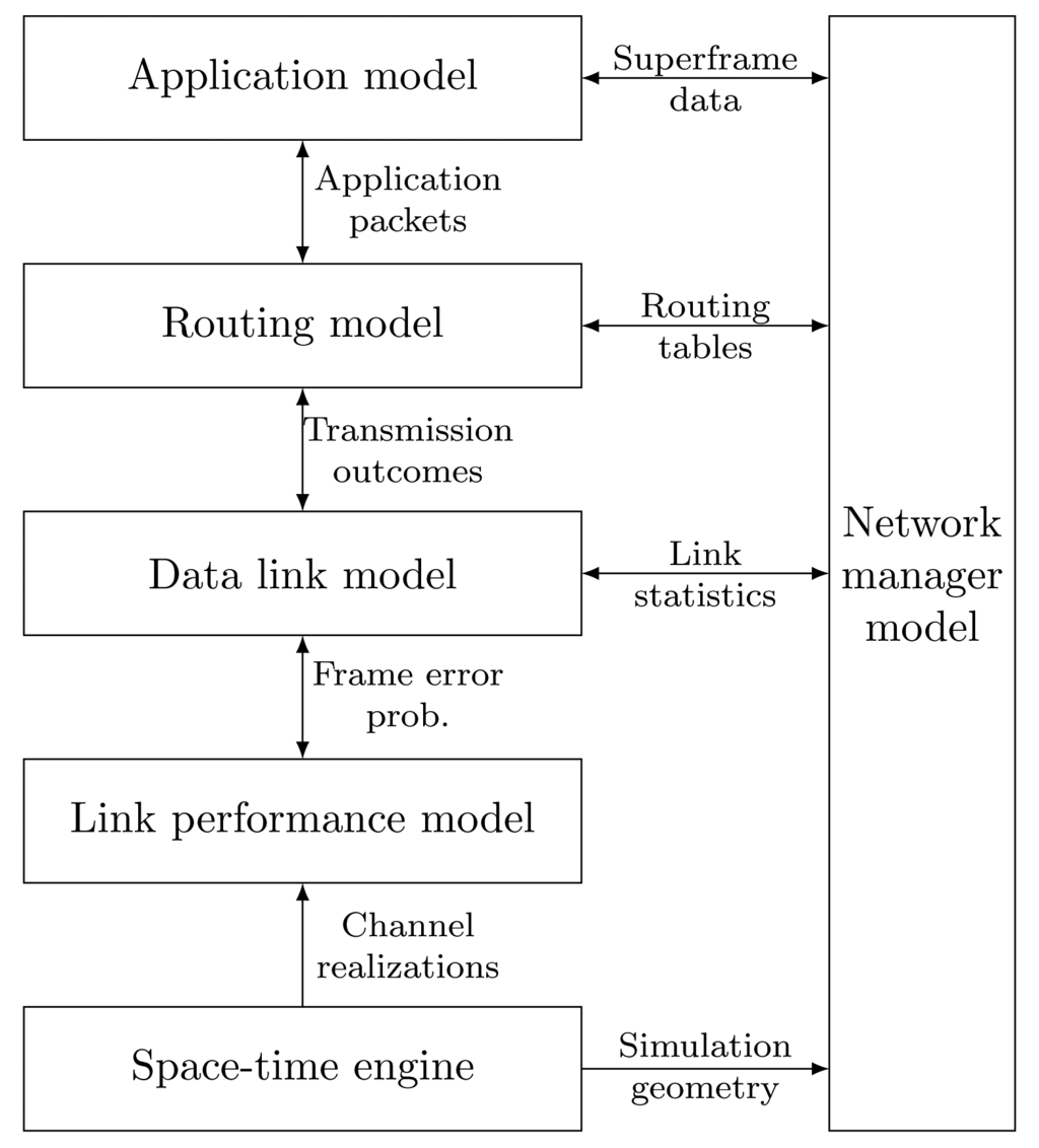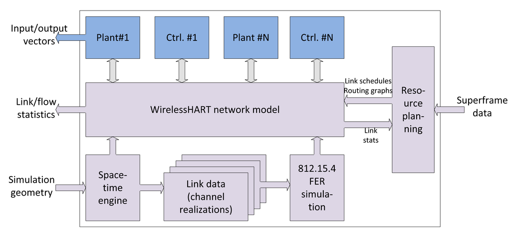 In the literature, there appear different efforts and approaches addressing the performance evaluation of various wireless mesh networks. Specifically, we can find similar efforts for modeling WirelessHART. As an example, [7] extends the basic, general-purpose IEEE 802.15.4 model of the ns-2 (network simulator 2) simulator with a detailed WirelessHART stack, including accurate modeling of the network time synchronization and other network management tasks. The implementation inherits the transmission range-based physical layer performance model approach from the IEEE 802.15.4 model, i.e., the success of a transmission only depends on the range between the corresponding nodes. Therefore, it does not aim at accurately modeling the lower layers. The ns-3 module in [8] adopts a simple two-state Gilbert–Elliot statistical model for packet errors without considering the underlying network. A different approach is taken by [9] by connecting a detailed packet-level network simulator (ns-2) and MATLAB Simulink for the dynamics simulations by using High Level Architecture (HLA) as the means of integration. Their efforts result in a more general, packet-level CPS evaluation framework. However, significant computational complexity results from the synchronization requirements between the two simulators, and accuracy is limited by the fairly simple physical layer models present in the ns-2 simulator.