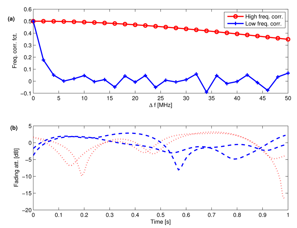 Figure 3a shows the frequency cross-correlation functions of {μ1(t)} for pure Rayleigh fading (K = −∞ dB), whereas Figure 3b shows 2 fading realizations obtained 50 MHz (10 channels) apart for L = 1 for high and low frequency correlation, according to Figure 3a, assuming a 1.5-Hz Doppler spread.