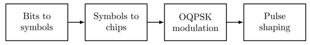 The standard IEEE 802.15.4 PHY for the 2.4 GHz band uses the offset quadrature phase shift keying (OQPSK)-based spread spectrum modulation technique. The transmit signal flow is illustrated in Figure 4. Blocks of four input bits are mapped to 32-chip sequences, which are, in turn, mapped to an offset-QPSK constellation. The subsequent pulse shaping uses half-sine pulses, so the resulting scheme can also be thought of as a constant envelope minimum shift keying (MSK) modulation. Typical receivers demodulate the signal either as MSK or by employing a coherent OQPSK demodulator.