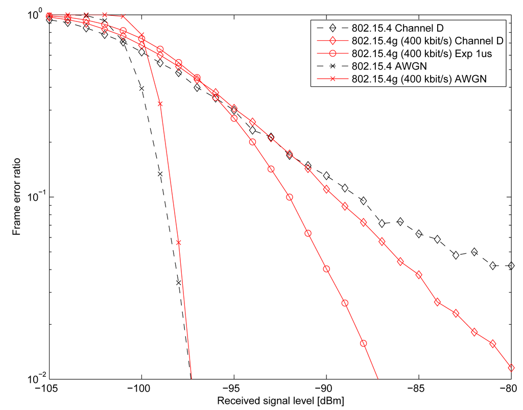 Figure 6 compares the link-level frame error rates for the legacy 802.15.4 PHY assuming a noncoherent correlation receiver, and the 802.15.4 g Option 2 MCS3 receiver, respectively. Transmit power is fixed at 0 dBm, and the size of the payload is 22 bytes. We can see that the non-fading (AWGN) performance is almost identical, whereas 802.15.4 performance starts to deteriorate even for the rather benign Channel D Rayleigh fading model. The 802.15.4 g receiver tolerates Channel D well and, as expected, can gain significant performance from the more frequency-selective “Exp” channel, benefiting from the fact that in the more frequency-selective channel, the subcarriers tend to fade more independently from each other. Therefore, the 802.15.4 g offers a higher data rate (400 kbit/s vs. 250 kbit/s) at 1/6th transmission bandwidth and significantly better performance in dispersive channels.