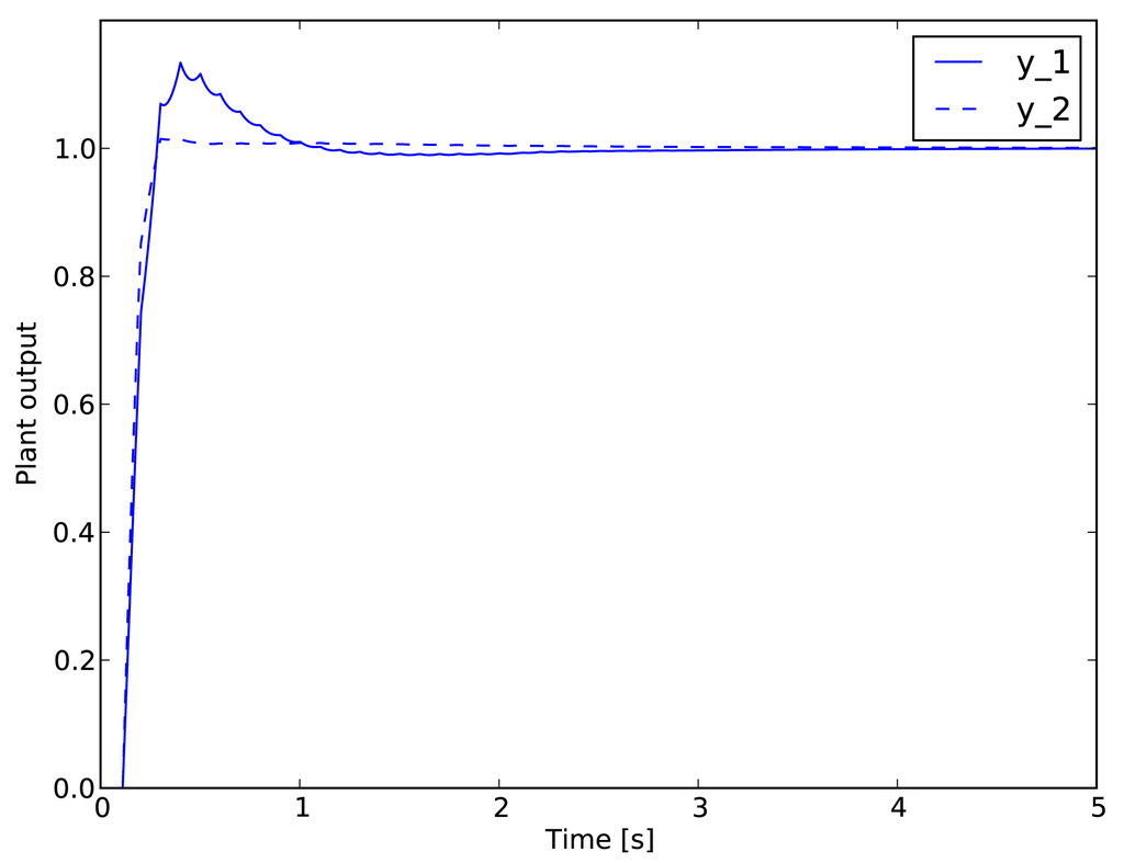 Although traditional standard benchmarks, such as the one in [20], assume that the plant is controlled by a fixed proportional-integral (PI) controller, in this paper, we use a model predictive controller (MPC). This kind of controller, with its variable time horizon, is generally more robust and provides better control performance with increased tolerance against the delays and outages of the wireless transmission; therefore, it is more relevant for today's practical deployments than the static PI controller often used for this particular benchmark. As in [20], we assume that only sensor measurements are transmitted over the wireless networks, whereas the controller output is connected to the actuators using a wired connection having negligible delay compared to the delays occurring in the wireless network. The step response of the controlled system with negligible delays in both directions is illustrated in Figure 7. The controller is designed with the following parameters: the control interval is 100 ms; the prediction horizon is 500 ms; and the actuation horizon is 200 ms.
