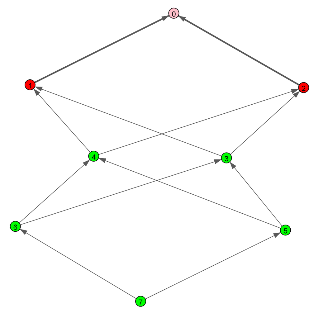 Firstly, we investigate the effects of different channel models on the stability of the batch reactor setup. The uplink graph is shown in Figure 8, with Node 7 being the sensor node; thus, the gateway is reachable within three wireless hops. The simulation parameters are summarized in Table 1. We compare the successful packet delivery ratios and the ratio of the stable outcomes for the batch reactor, with three different Ricean K-factors and three different frequency correlation values (the independent block fading channel, the frequency-correlated channel with low correlation, στ = 2 ns, and the frequency-correlated channel with high correlation, στ = 100 ns.) We run every 10 s-long independent simulation trial 500 times. In order to assess the simulation efficiency, each run takes approximately one second on an Intel Xeon CPU running at 3 GHz.