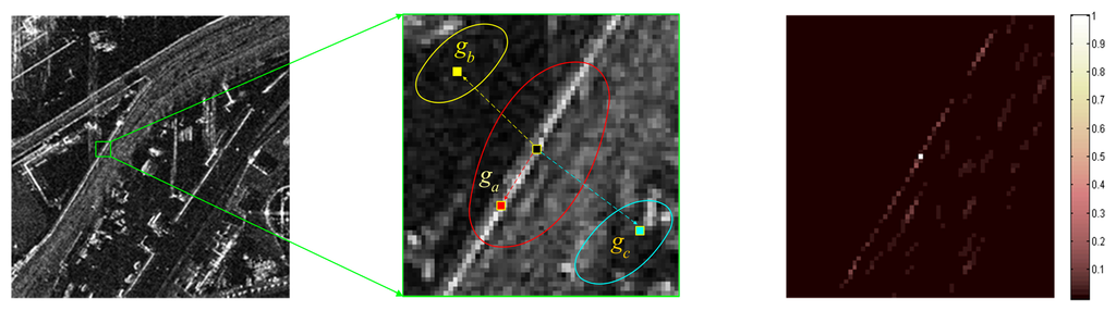 The AR model performs well in a local stationary window. However, in practice, the waveforms vary significantly across the whole SAR image, and the statistical stationary assumption does not always hold [13]. Especially when the scale of a local structure feature is smaller than the selected local window size, the piecewise stationary assumption is violated. Take Figure 1 for example, where Figure 1b is the close-up view of the selected local area in the green window in Figure 1a. Although the statistical property keeps stationary within each ellipse region, it varies significantly across various ellipses. To be specific, to estimate the pixel qi on the edge, samples within the red region (e.g., pixel qa) can provide more reasonable local structure information than those in the yellow (e.g., pixel qb) and blue (e.g., pixel qc) regions. If pixels in the yellow and blue regions are engaged with the same weights, using the AR model in Equation (11) will lead to a degraded description of the local image structure.