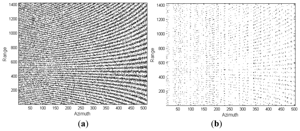 In this experiment, a visual comparison is presented to show the feasibility of the proposed ASR-CS-SAR imaging approach. The primary radar parameters are enumerated in Table 2. By applying the random undersampling scheme mentioned in Section 2, 33% of Nyquist rate samples in range as well as 25% in azimuth are adopted, which implies that only 1/12 full aperture data is used for reconstruction. Figure 3a,b depict the full echo data and the associated undersampled return, respectively. To facilitate comparison, SAR imaging with full aperture data is displayed in Figure 4.
