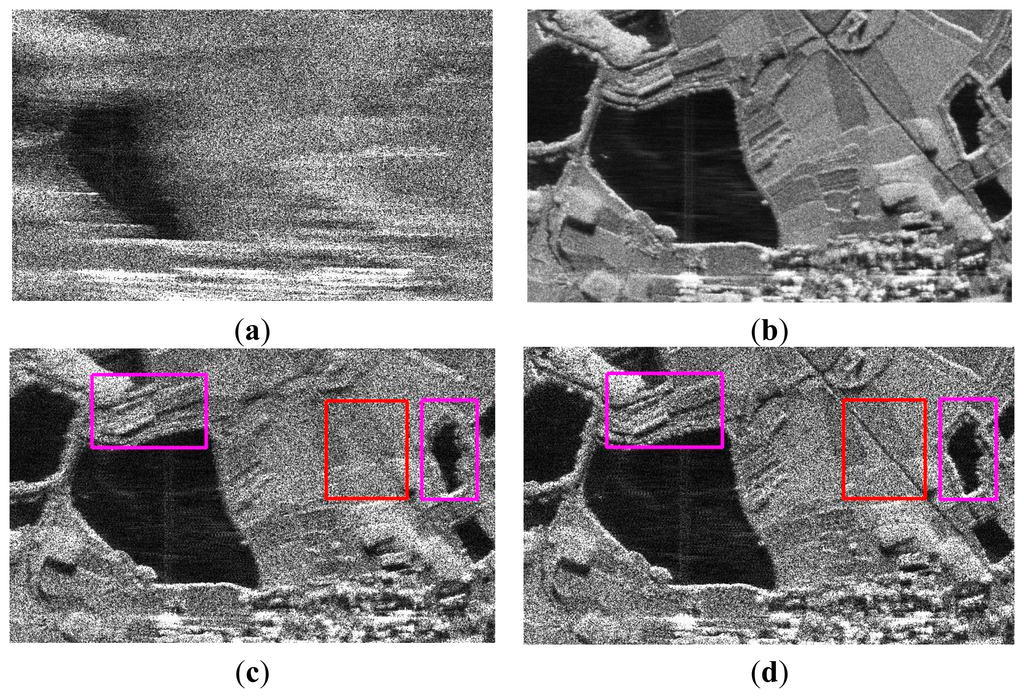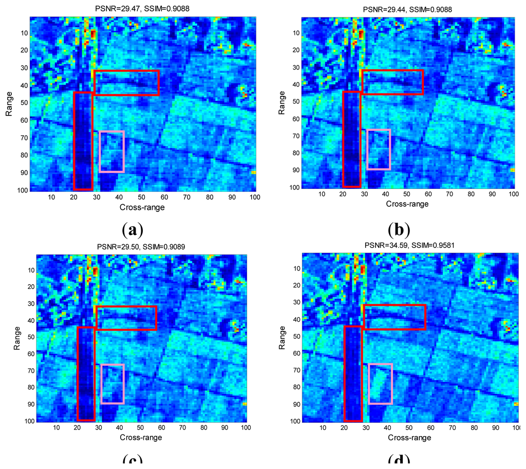Figure 5a–c present the reconstructed images by the conventional CS-SAR approaches, and Figure 5d is the image reconstructed by the proposed ASR-CS-SAR approach. From these figures, we can see that most information on the SAR images is preserved. However, for the conventional CS-SAR approaches, they still suffer from a series of artifacts. Specifically, the textures of the roads in the red rectangle window are seriously merged and it is hard distinguish them from the terraced fields. Similarly, the terrace in the pink rectangle window has been blurred. However, those artifacts are suppressed in Figure 5d and a sharper and clearer visual result can be obtained by the proposed approach. The superior performance of the ASR-CS-SAR is also demonstrated by the values of image quality metrics, i.e., PSNR and SSIM, for the maximum gap in PSNR between our approach and the competing methods is up to 7.15 dB.
