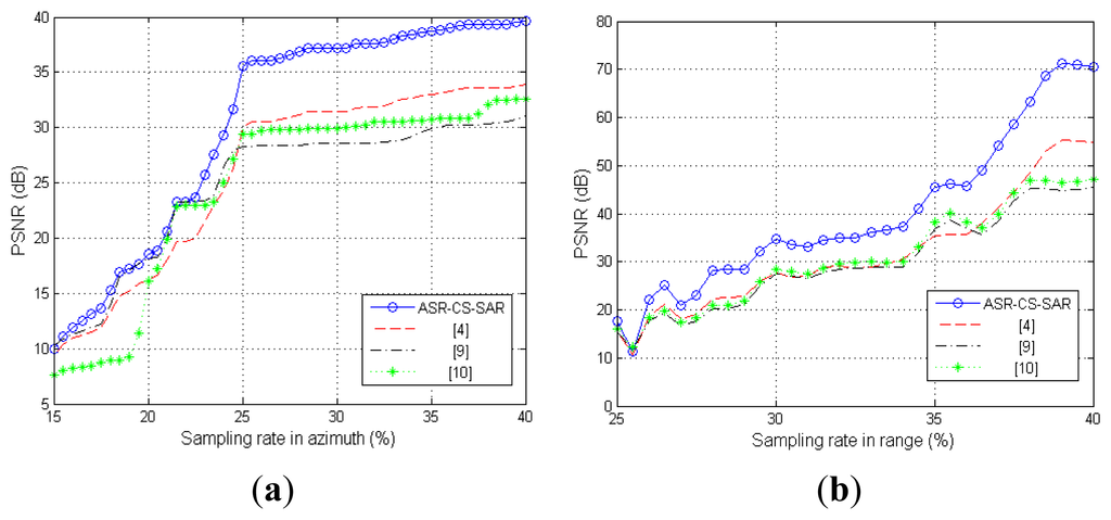 Figure 6a shows that all the PSNR curves rise sharply as the sampling rate in azimuth increases. However, our proposed approach outperforms others for each sampling rate; furthermore, the advantage becomes more and more apparent with the increase of the sampling rate. Similar conclusions can also be drawn from the results in Figure 6b.
